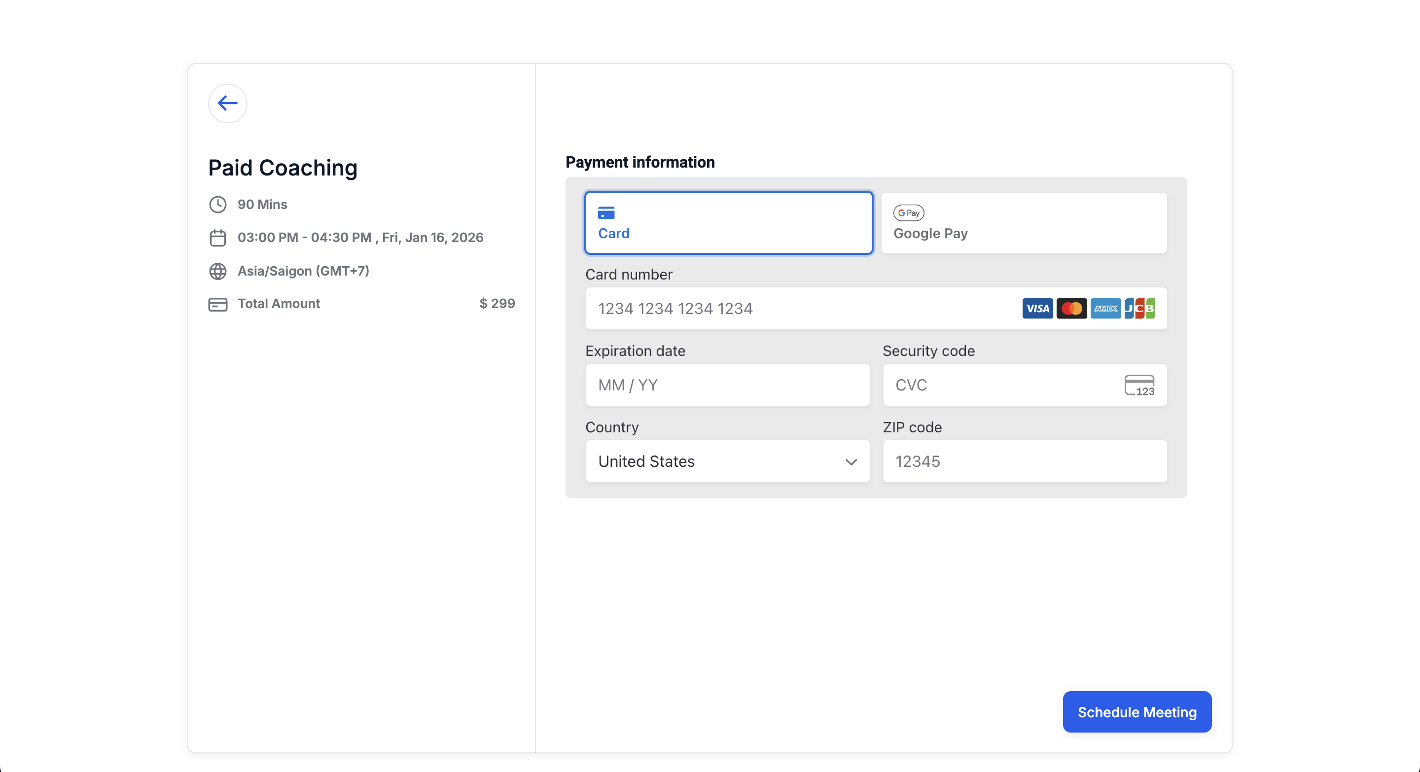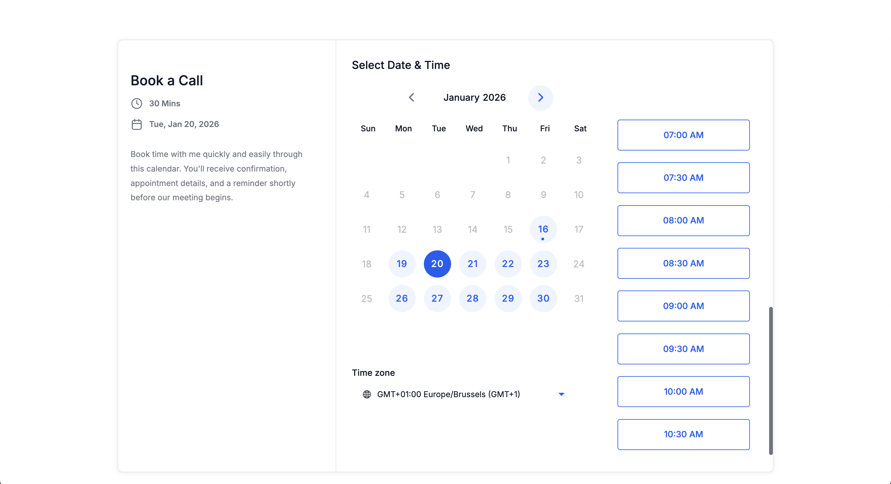 You can set up as many appointment types as you need, each with its own duration, availability, and settings. This works well for consultations, paid sessions, follow-ups, or team scheduling.