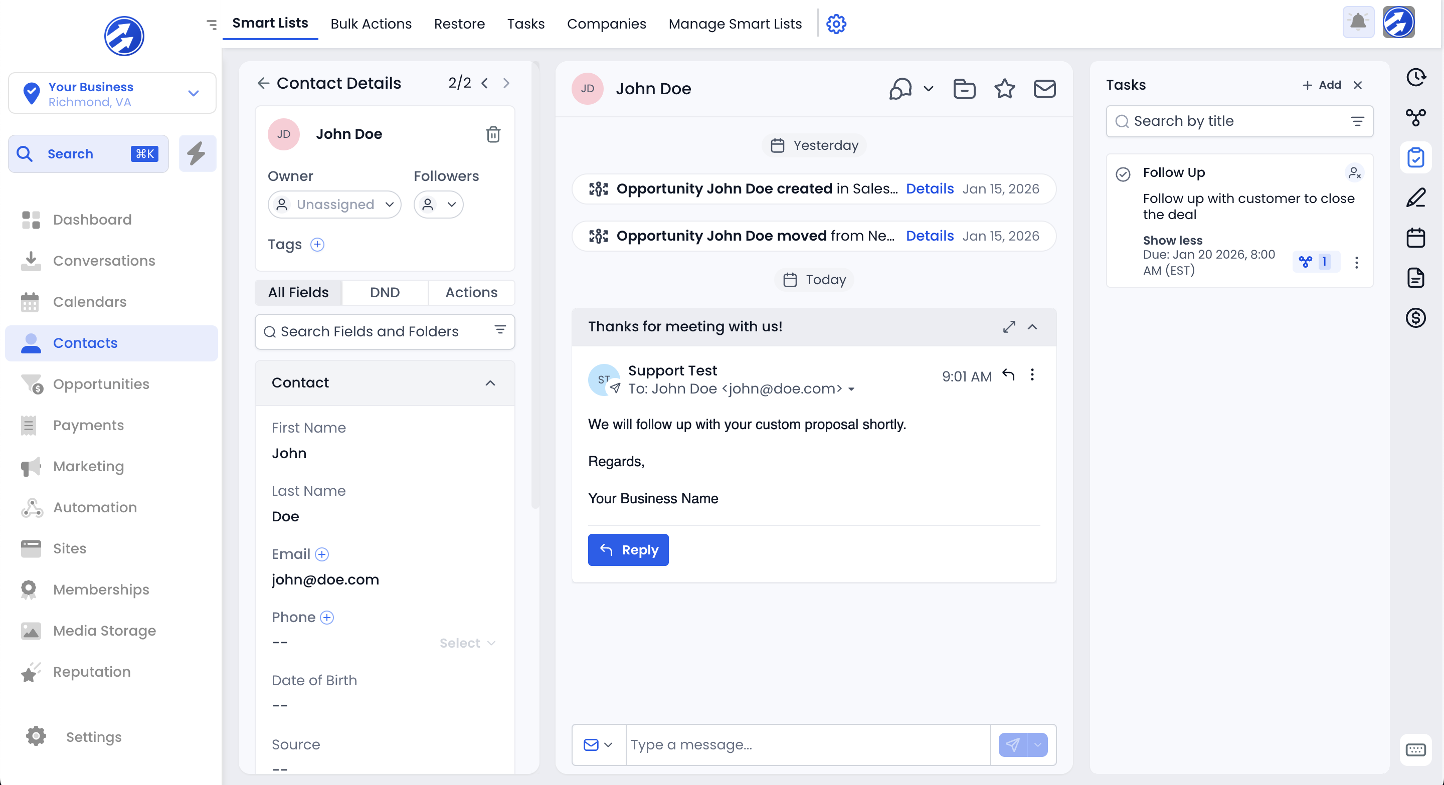 Yes. Every email, SMS, call, note, invoice, booking, and task is logged inside the contact’s profile so you always know what happened and what to do next.