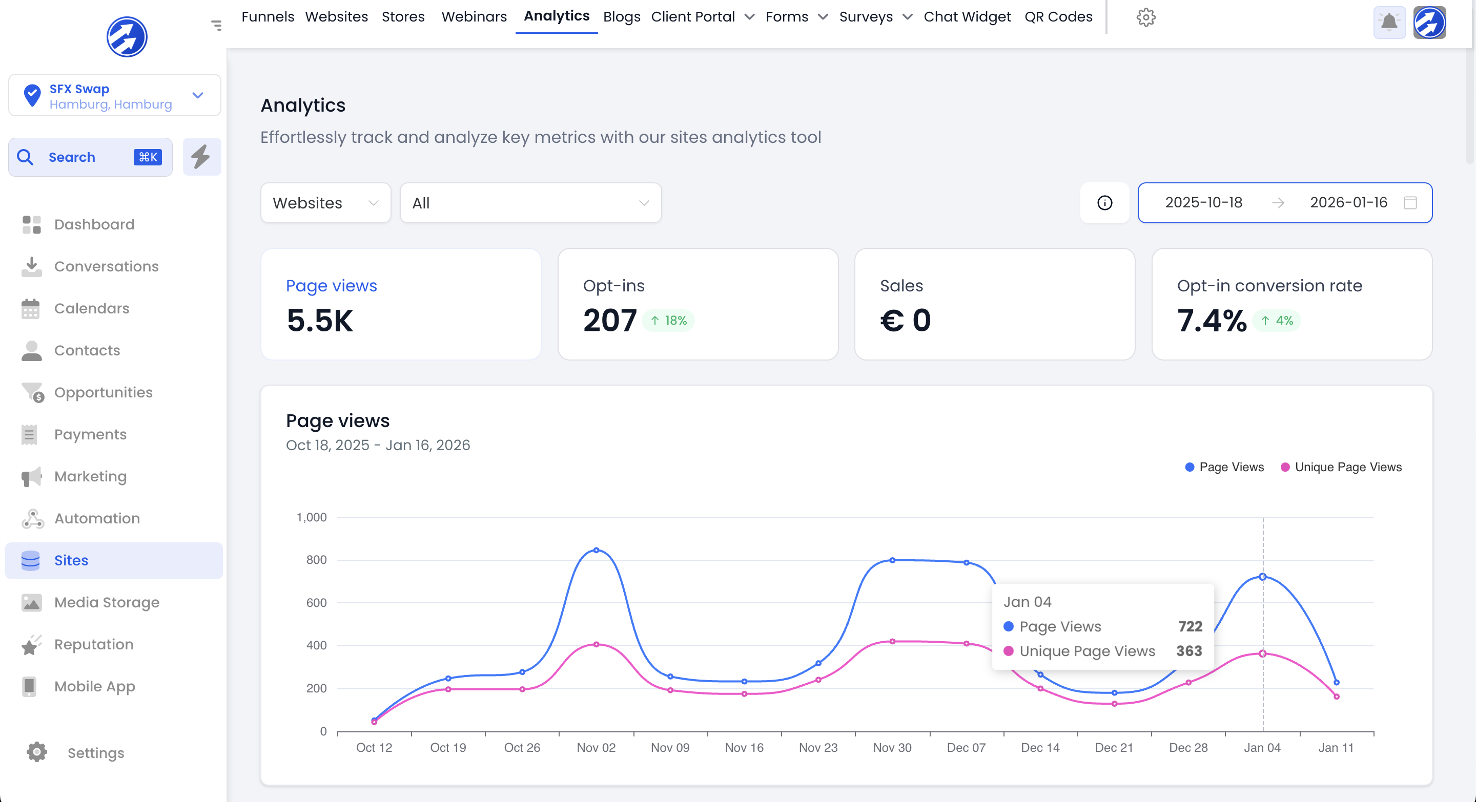 Yes. We have a full suite of analytics for your sites and funnels. Also, every form, survey, checkout, or booking automatically syncs with your CRM. You can see where leads come from and trigger automations instantly.