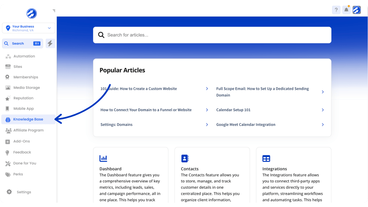 To access them, you can either navigate to the "Knowledge Base" in the account menu...